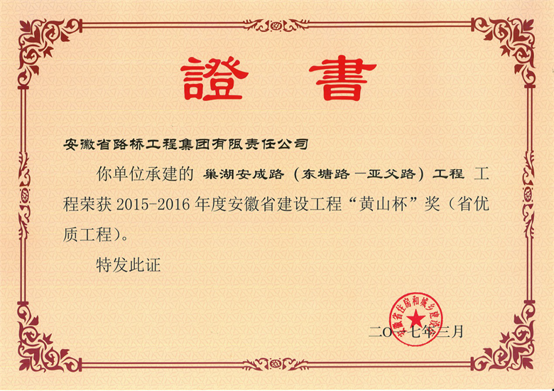 近日,安徽省建設(shè)廳發(fā)文公布了2015-2016年安徽省建設(shè)工程“黃山杯”獲獎(jiǎng)項(xiàng)目名單,我公司承建的績(jī)溪至黃山(歙縣呈村降)高速公路、巢湖安成路(東塘路-亞父路)工程、壽縣蜀山現(xiàn)代產(chǎn)業(yè)園壽州大道、蜀山大道建設(shè)工程3個(gè)項(xiàng)目榮獲該殊榮。