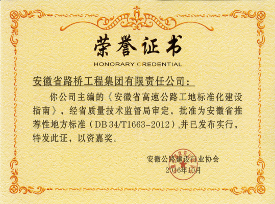 在系列指南編寫中,公司承擔(dān)了《安徽省高速公路工地標(biāo)準(zhǔn)化建設(shè)指南》(DB 34/T 1663-2012)的主編和《安徽省高速公路施工標(biāo)準(zhǔn)化指南 第5部分:隧道工程》(DB 34/T 2558-2015)的參編工作,其中主編的《安徽省高速公路工地標(biāo)準(zhǔn)化建設(shè)指南》及主要編寫人員獲得表彰。