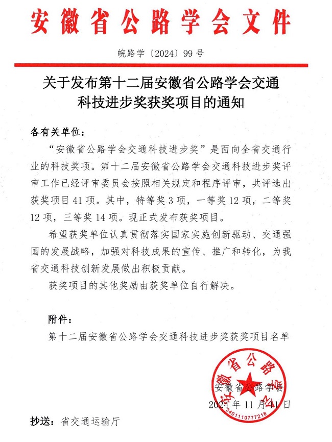 “安徽省公路學(xué)會(huì)交通科技進(jìn)步獎(jiǎng)”是面向全省交通行業(yè)的科技獎(jiǎng)項(xiàng)。第十二屆交通科技進(jìn)步獎(jiǎng)評審工作經(jīng)評審委員會(huì)按照相關(guān)規(guī)定和程序評審,共評選出獲獎(jiǎng)項(xiàng)目41項(xiàng)。