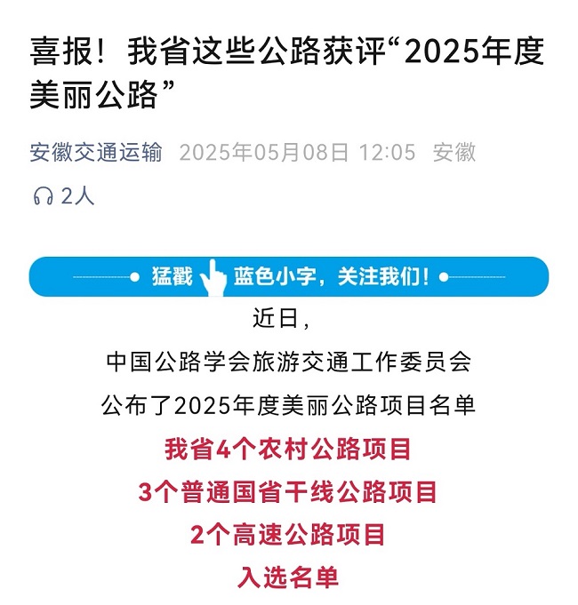 近日,中國(guó)公路學(xué)會(huì)旅游交通工作委員會(huì)公布了“2025年度美麗公路項(xiàng)目名單”,安徽省4個(gè)農(nóng)村公路項(xiàng)目、3個(gè)普通國(guó)省干線公路項(xiàng)目、2個(gè)高速公路項(xiàng)目入選名單。由建工建投集團(tuán)承建的G4012溧寧高速黃山至千島湖安徽段成功獲評(píng)!