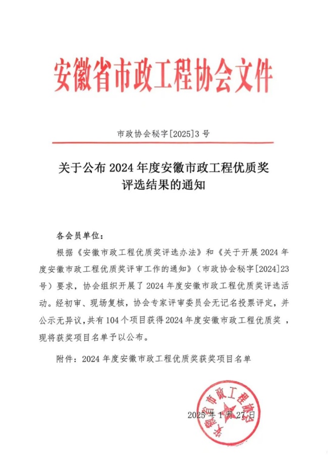 2025年1月27日,安徽省市政工程協(xié)會發(fā)布文件《關于公布2024年度安徽市政工程優(yōu)質(zhì)獎評選結(jié)果的通知》,由建工建投集團主申報的肥東經(jīng)開區(qū)火龍山路(魏武路-東方大道)建設工程,白馬山路(學林路-關井路)等三條道路建設工程,新站高新區(qū)青龍山路(梅沖湖路-荃湖北路)道路工程,新站高新區(qū)鶴翔湖路等五條路工程施工、城市排水管網(wǎng)改造(二期)工程,靈璧縣迎賓大道(鳳河至汴河路段)、奇石大道(濱河路至凌山路段),汴河路(迎賓大道至薄山路段),合廬產(chǎn)業(yè)新城龍橋路等8條市政道路工程施工-2標段,靈璧縣城市路網(wǎng)PPP項目一期(調(diào)入部分)工程-鳳山大道等共計8個項目榮列獲獎名單!