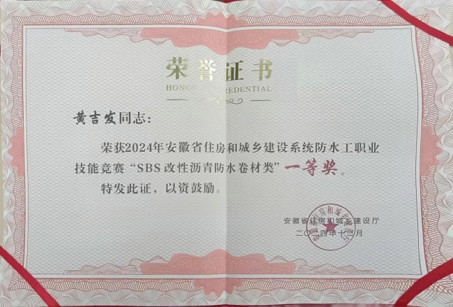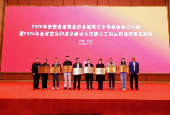 11月9日,2025年安徽省建筑業(yè)協(xié)會(huì)建筑防水專業(yè)委員會(huì)會(huì)員大會(huì)暨2024年全省住房和城鄉(xiāng)建設(shè)系統(tǒng)防水工職業(yè)技能競(jìng)賽表彰會(huì)在合肥隆重舉行。會(huì)議對(duì)在2024年全省防水工職業(yè)技能競(jìng)賽中表現(xiàn)突出的單位和個(gè)人進(jìn)行了表彰。建工建投集團(tuán)榮獲“SBS改性瀝青防水卷材類”團(tuán)體一等獎(jiǎng),員工黃吉發(fā)榮獲個(gè)人一等獎(jiǎng),現(xiàn)場(chǎng)登臺(tái)領(lǐng)獎(jiǎng)受譽(yù)。